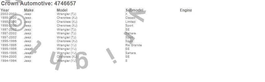 Crown Automotive is the premier manufacturer and distributor of quality replacement parts for Jeep® CJ™, Wrangler™, Cherokee™, Grand Cherokee™, Liberty™, and Commander™."From humble beginnings in 1963 in a small Boston storefront, Crown Automotive has consistently maintained its commitment to offering only quality parts and exceptional service. Today, with warehouses in Massachusetts, Georgia, Nevada, Spain, and the Czech Republic, totaling over 160,000 square feet, Crown Automotive continues to be the leader in quality replacement parts for Jeep® vehicles. With over 8,000 different parts in stock for Jeep® vehicles from 1942 on up, Crown has the largest stock of replacement parts for Jeep® vehicles, including factory-discontinued parts. In fact, many of the older Jeeps are still on (and off) the road thanks to Crown parts. The Crown line consists of axle, body, brake, clutch, cooling, driveline, electrical, engine, exhaust, fuel, steering, suspension, transmission and transfer case components. Crown Automotive also offers an exclusive line of component kits and accessory products. Because we know that Jeeps are driven harder than most other vehicles, we emphasize offering only quality parts. In fact, we test parts on Jeeps before distributing them to our dealers to insure that they meet our standards for quality. Crown also supports its entire line with a 12 month/12,000 mile warranty to insure our dealers and their customers of our commitment to offering quality parts. We know from experience that Jeep® owners would rather pay a little more for a good quality part that's backed by a strong guarantee. But we know that price is important as well. So, not only will you find Crown parts to be of exceptional quality, but you'll find them at a great price too.