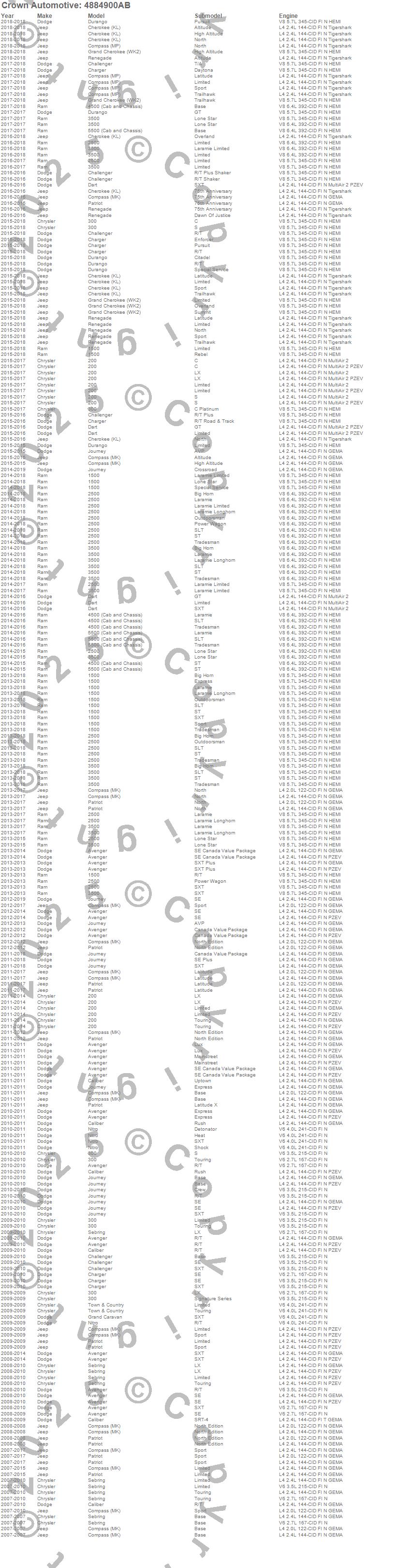 1500, 200, 2500, 300, 3500, Avenger, Caliber, Challenger, Charger, Cherokee (KL), Compass, Grand Caravan, Journey, Nitro, Patriot, Sebring, Town & Country, Chrysler, Dodge, Jeep more…