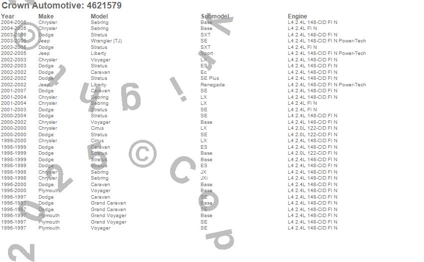 Caravan, Cirrus, Grand Caravan, Grand Voyager, Liberty, Sebring, Stratus, Voyager, Wrangler (TJ), Chrysler, Dodge, Jeep, Plymouth, 2007, 2006, 2005, 2004, 2003, 2002, 2001 more…