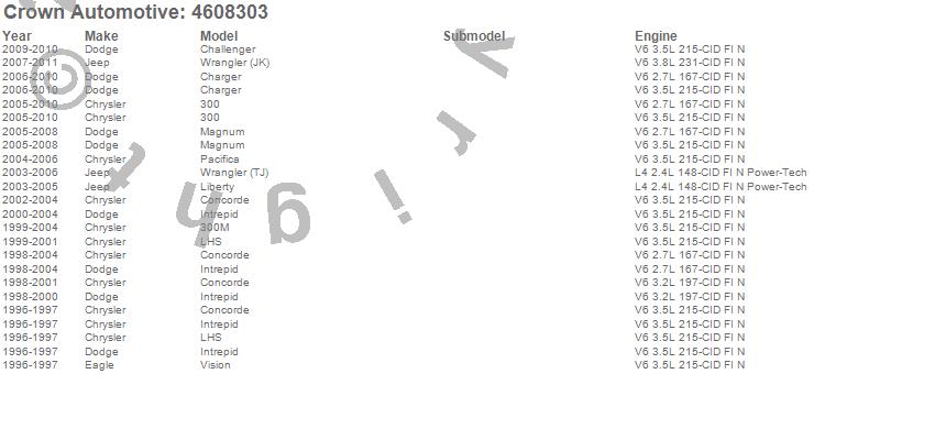 300, 300M, Challenger, Charger, Concorde, Intrepid, LHS, Liberty, Magnum, Pacifica, Vision, Wrangler (JK), Wrangler (TJ), Chrysler, Dodge, Eagle, Jeep, 2011, 2010, 2009 more…