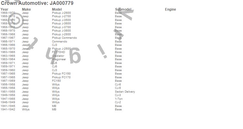 1-Ton Pickup, CJ-2A, CJ-3A, CJ-3B, CJ3, CJ5, CJ6, Commando, FC150, FC170, FC170HD, Gladiator, J-2500, J-2600, J-2700, J-2800, J-3500, J-3600, J-3700, J-3800 more…