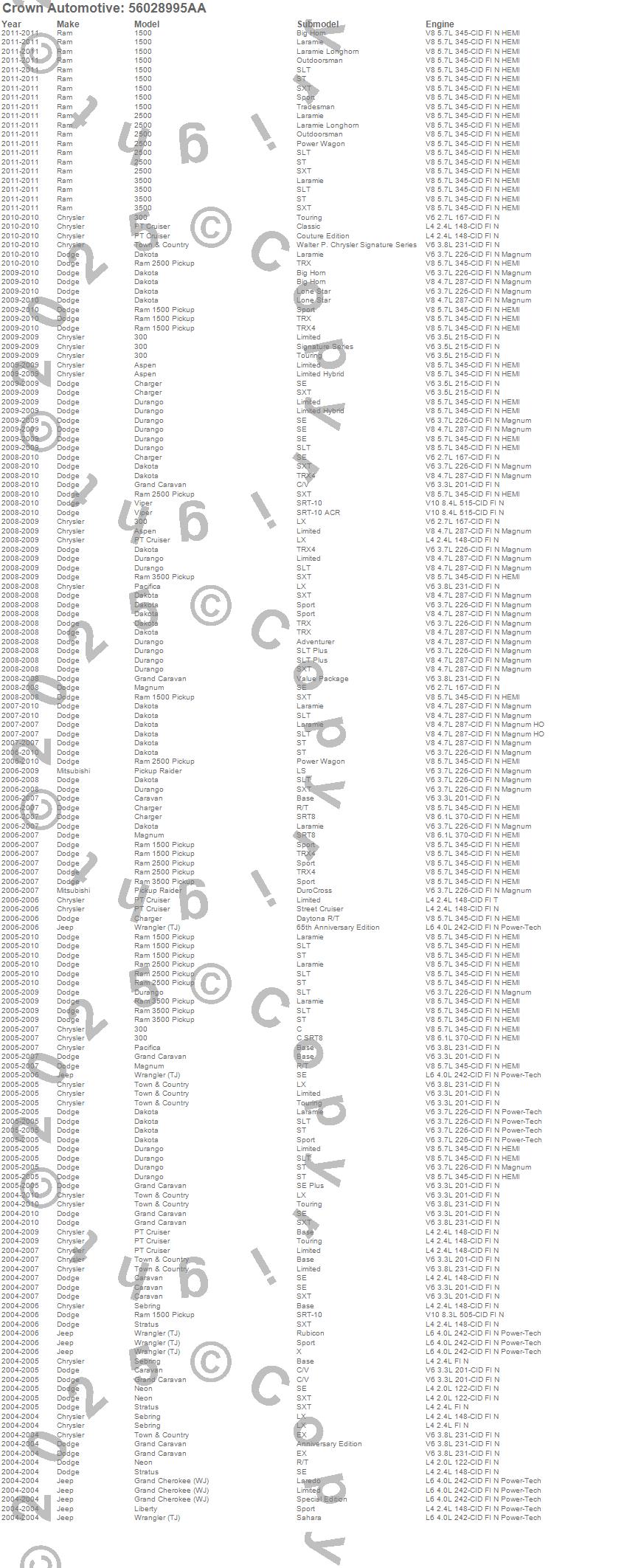 1500, 2500, 300, 3500, Aspen, Caravan, Charger, Dakota, Durango, Grand Caravan, Grand Cherokee (WJ), Liberty, Magnum, Neon, Pacifica, PT Cruiser, Raider, Ram 1500, Ram 2500, Ram 3500 more…