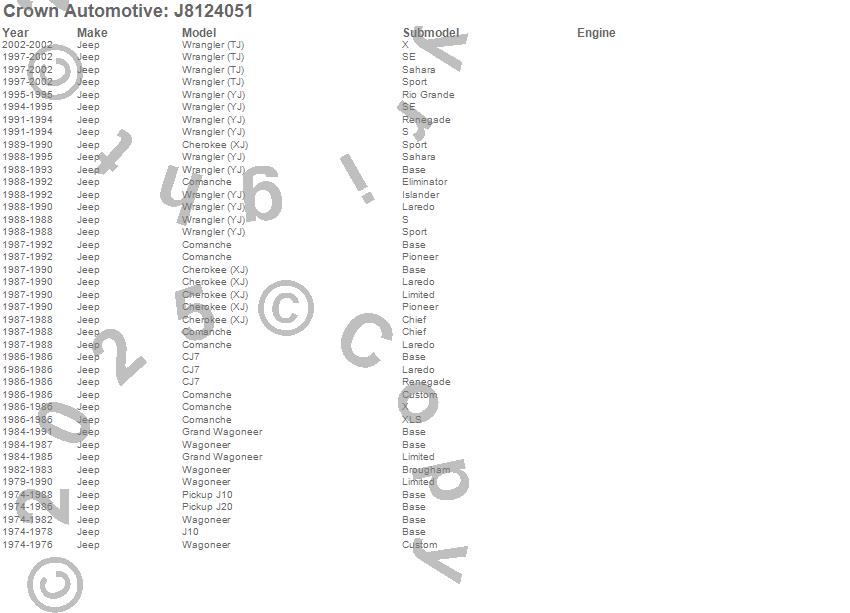 Cherokee (XJ), CJ7, Comanche, Grand Wagoneer, J10, J20, Wagoneer, Wrangler (TJ), Wrangler (YJ), Jeep, 2002, 2001, 2000, 1999, 1998, 1997, 1995, 1994, 1993, 1992 more…