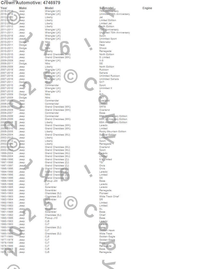 Crown Automotive is the premier manufacturer and distributor of quality replacement parts for Jeep® CJ™, Wrangler™, Cherokee™, Grand Cherokee™, Liberty™, and Commander™."From humble beginnings in 1963 in a small Boston storefront, Crown Automotive has consistently maintained its commitment to offering only quality parts and exceptional service. Today, with warehouses in Massachusetts, Georgia, Nevada, Spain, and the Czech Republic, totaling over 160,000 square feet, Crown Automotive continues to be the leader in quality replacement parts for Jeep® vehicles. With over 8,000 different parts in stock for Jeep® vehicles from 1942 on up, Crown has the largest stock of replacement parts for Jeep® vehicles, including factory-discontinued parts. In fact, many of the older Jeeps are still on (and off) the road thanks to Crown parts. The Crown line consists of axle, body, brake, clutch, cooling, driveline, electrical, engine, exhaust, fuel, steering, suspension, transmission and transfer case components. Crown Automotive also offers an exclusive line of component kits and accessory products. Because we know that Jeeps are driven harder than most other vehicles, we emphasize offering only quality parts. In fact, we test parts on Jeeps before distributing them to our dealers to insure that they meet our standards for quality. Crown also supports its entire line with a 12 month/12,000 mile warranty to insure our dealers and their customers of our commitment to offering quality parts. We know from experience that Jeep® owners would rather pay a little more for a good quality part that's backed by a strong guarantee. But we know that price is important as well. So, not only will you find Crown parts to be of exceptional quality, but you'll find them at a great price too.