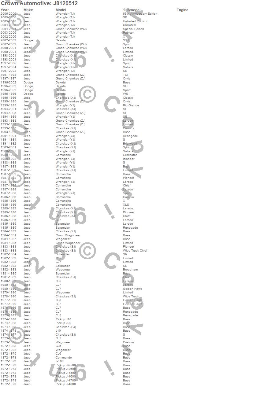 Cherokee (SJ), Cherokee (XJ), CJ5, CJ6, CJ7, Comanche, Commando, Dakota, DJ5, DJ5C, DJ5F, DJ5M, Grand Cherokee (WJ), Grand Cherokee (ZJ), Grand Wagoneer, J-100, J-2500, J-2600, J-4500, J-4600 more…