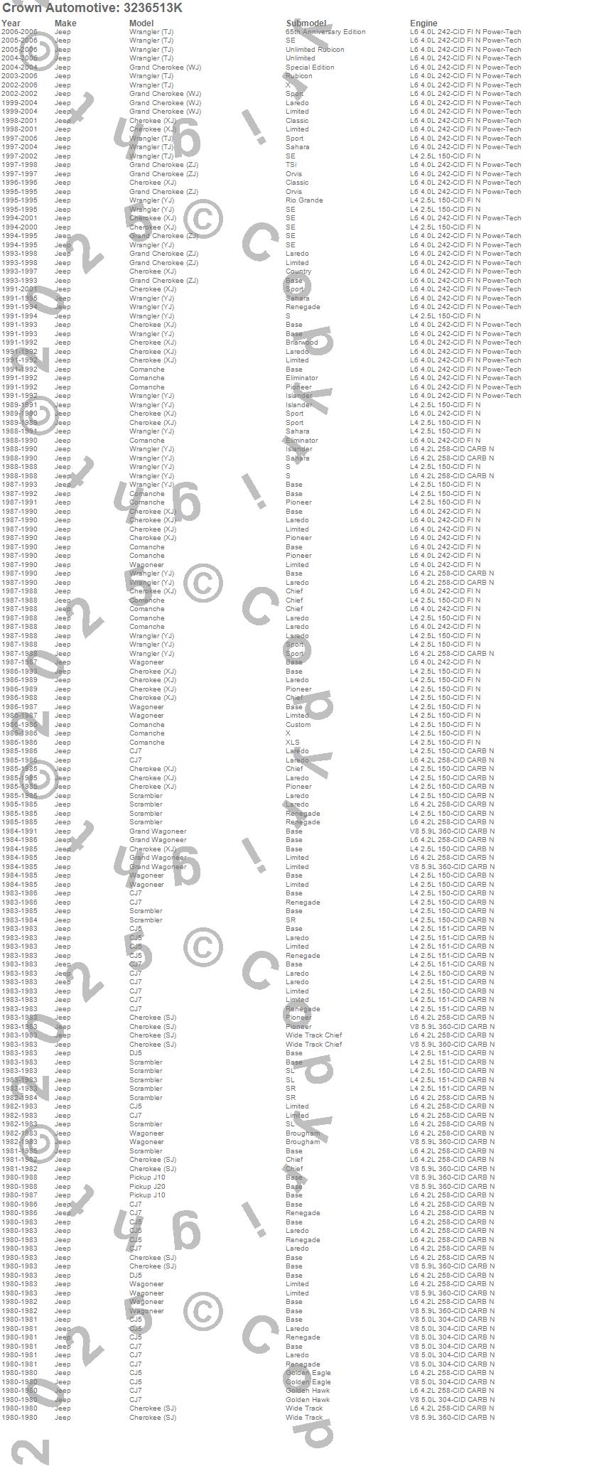 Cherokee (SJ), Cherokee (XJ), CJ5, CJ7, Comanche, DJ5, DJ5M, Grand Cherokee (WJ), Grand Cherokee (ZJ), Grand Wagoneer, J10, J20, Scrambler, Wagoneer, Wrangler (LJ), Wrangler (TJ), Wrangler (YJ), Jeep, 2006, 2005 more…