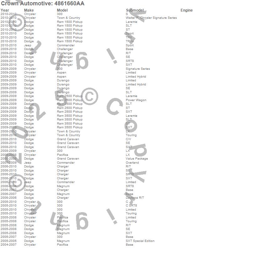 300, Aspen, Caravan, Challenger, Charger, Commander, Durango, Grand Caravan, Magnum, Pacifica, Ram 1500, Ram 2500, Ram 3500, Town & Country, Chrysler, Dodge, Jeep, 2010, 2009, 2008 more…