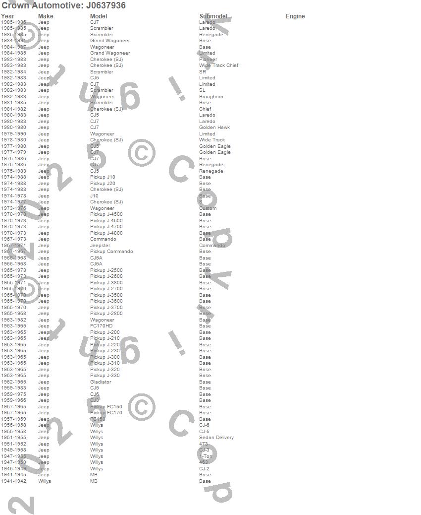 1-Ton Pickup, Cherokee (SJ), CJ-2A, CJ-3A, CJ-3B, CJ3, CJ5, CJ5A, CJ6, CJ6A, CJ7, Commando, FC150, FC170, FC170HD, Gladiator, Grand Wagoneer, J-200, J-210, J-220 more…