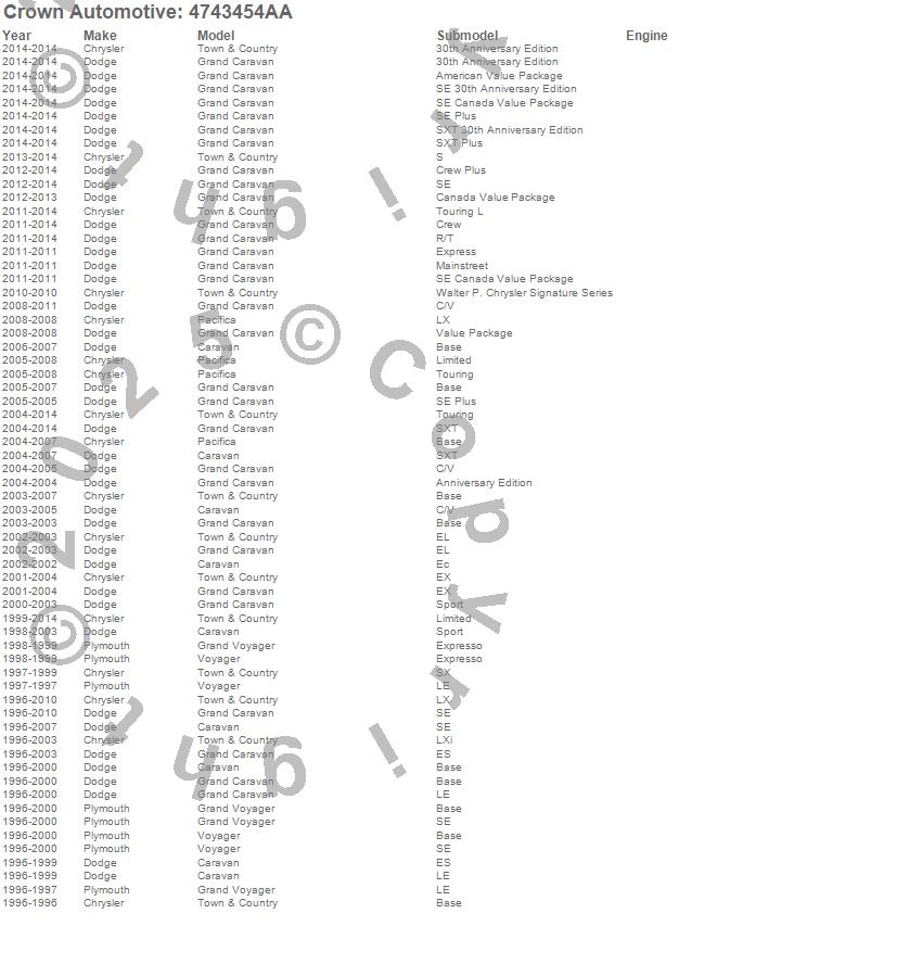 Caravan, Grand Caravan, Grand Voyager, Pacifica, Town & Country, Voyager, Chrysler, Dodge, Plymouth, 2011, 2010, 2009, 2008, 2007, 2006, 2005, 2004, 2003, 2002, 2001 more…