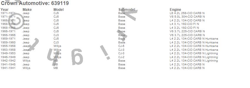 Crown Automotive is the premier manufacturer and distributor of quality replacement parts for Jeep® CJ™, Wrangler™, Cherokee™, Grand Cherokee™, Liberty™, and Commander™."From humble beginnings in 1963 in a small Boston storefront, Crown Automotive has consistently maintained its commitment to offering only quality parts and exceptional service. Today, with warehouses in Massachusetts, Georgia, Nevada, Spain, and the Czech Republic, totaling over 160,000 square feet, Crown Automotive continues to be the leader in quality replacement parts for Jeep® vehicles. With over 8,000 different parts in stock for Jeep® vehicles from 1942 on up, Crown has the largest stock of replacement parts for Jeep® vehicles, including factory-discontinued parts. In fact, many of the older Jeeps are still on (and off) the road thanks to Crown parts. The Crown line consists of axle, body, brake, clutch, cooling, driveline, electrical, engine, exhaust, fuel, steering, suspension, transmission and transfer case components. Crown Automotive also offers an exclusive line of component kits and accessory products. Because we know that Jeeps are driven harder than most other vehicles, we emphasize offering only quality parts. In fact, we test parts on Jeeps before distributing them to our dealers to insure that they meet our standards for quality. Crown also supports its entire line with a 12 month/12,000 mile warranty to insure our dealers and their customers of our commitment to offering quality parts. We know from experience that Jeep® owners would rather pay a little more for a good quality part that's backed by a strong guarantee. But we know that price is important as well. So, not only will you find Crown parts to be of exceptional quality, but you'll find them at a great price too.