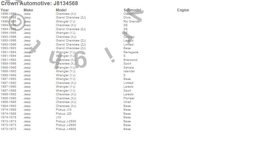 Cherokee (XJ), Grand Cherokee (ZJ), J-2500, J-2600, J-4800, J10, J20, Wrangler (YJ), Jeep, 1996, 1995, 1994, 1993, 1992, 1991, 1990, 1989, 1988, 1987, 1986 more…