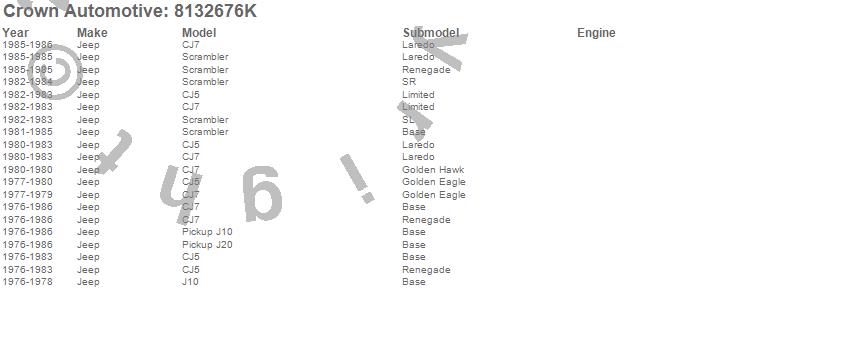 Crown Automotive is the premier manufacturer and distributor of quality replacement parts for Jeep® CJ™, Wrangler™, Cherokee™, Grand Cherokee™, Liberty™, and Commander™."From humble beginnings in 1963 in a small Boston storefront, Crown Automotive has consistently maintained its commitment to offering only quality parts and exceptional service. Today, with warehouses in Massachusetts, Georgia, Nevada, Spain, and the Czech Republic, totaling over 160,000 square feet, Crown Automotive continues to be the leader in quality replacement parts for Jeep® vehicles. With over 8,000 different parts in stock for Jeep® vehicles from 1942 on up, Crown has the largest stock of replacement parts for Jeep® vehicles, including factory-discontinued parts. In fact, many of the older Jeeps are still on (and off) the road thanks to Crown parts. The Crown line consists of axle, body, brake, clutch, cooling, driveline, electrical, engine, exhaust, fuel, steering, suspension, transmission and transfer case components. Crown Automotive also offers an exclusive line of component kits and accessory products. Because we know that Jeeps are driven harder than most other vehicles, we emphasize offering only quality parts. In fact, we test parts on Jeeps before distributing them to our dealers to insure that they meet our standards for quality. Crown also supports its entire line with a 12 month/12,000 mile warranty to insure our dealers and their customers of our commitment to offering quality parts. We know from experience that Jeep® owners would rather pay a little more for a good quality part that's backed by a strong guarantee. But we know that price is important as well. So, not only will you find Crown parts to be of exceptional quality, but you'll find them at a great price too.