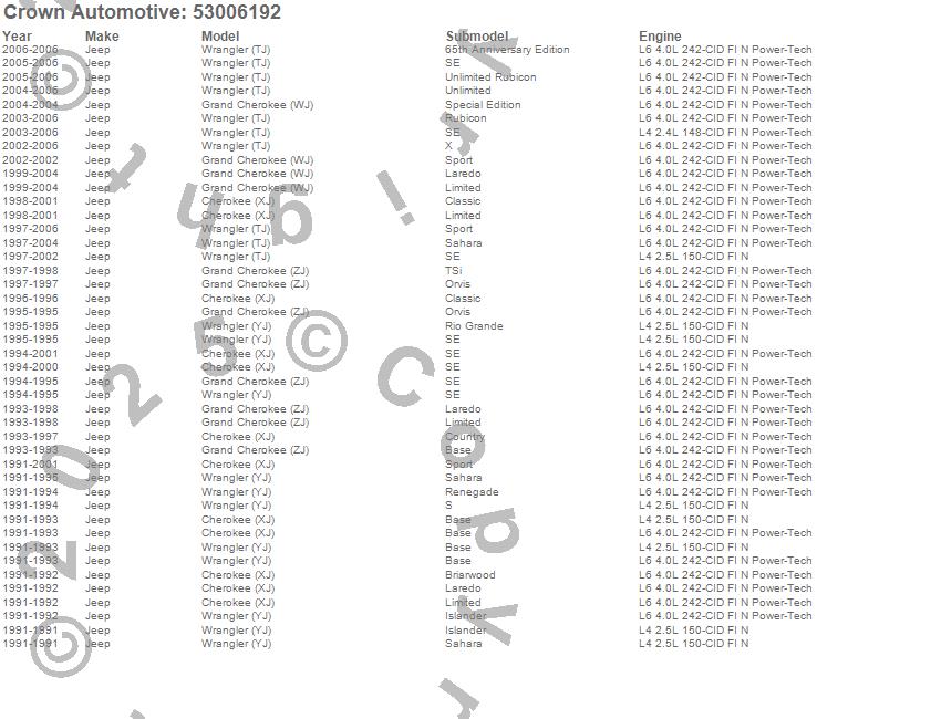 Cherokee (XJ), Grand Cherokee (WJ), Grand Cherokee (ZJ), Wrangler (LJ), Wrangler (TJ), Wrangler (YJ), Jeep, 2006, 2005, 2004, 2003, 2002, 2001, 2000, 1999, 1998, 1997, 1996, 1995, 1994 more…