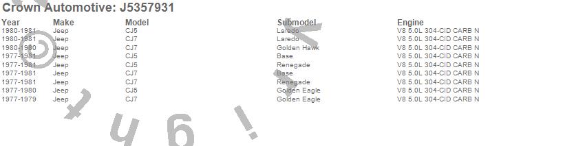 Crown Automotive is the premier manufacturer and distributor of quality replacement parts for Jeep® CJ™, Wrangler™, Cherokee™, Grand Cherokee™, Liberty™, and Commander™."From humble beginnings in 1963 in a small Boston storefront, Crown Automotive has consistently maintained its commitment to offering only quality parts and exceptional service. Today, with warehouses in Massachusetts, Georgia, Nevada, Spain, and the Czech Republic, totaling over 160,000 square feet, Crown Automotive continues to be the leader in quality replacement parts for Jeep® vehicles. With over 8,000 different parts in stock for Jeep® vehicles from 1942 on up, Crown has the largest stock of replacement parts for Jeep® vehicles, including factory-discontinued parts. In fact, many of the older Jeeps are still on (and off) the road thanks to Crown parts. The Crown line consists of axle, body, brake, clutch, cooling, driveline, electrical, engine, exhaust, fuel, steering, suspension, transmission and transfer case components. Crown Automotive also offers an exclusive line of component kits and accessory products. Because we know that Jeeps are driven harder than most other vehicles, we emphasize offering only quality parts. In fact, we test parts on Jeeps before distributing them to our dealers to insure that they meet our standards for quality. Crown also supports its entire line with a 12 month/12,000 mile warranty to insure our dealers and their customers of our commitment to offering quality parts. We know from experience that Jeep® owners would rather pay a little more for a good quality part that's backed by a strong guarantee. But we know that price is important as well. So, not only will you find Crown parts to be of exceptional quality, but you'll find them at a great price too.