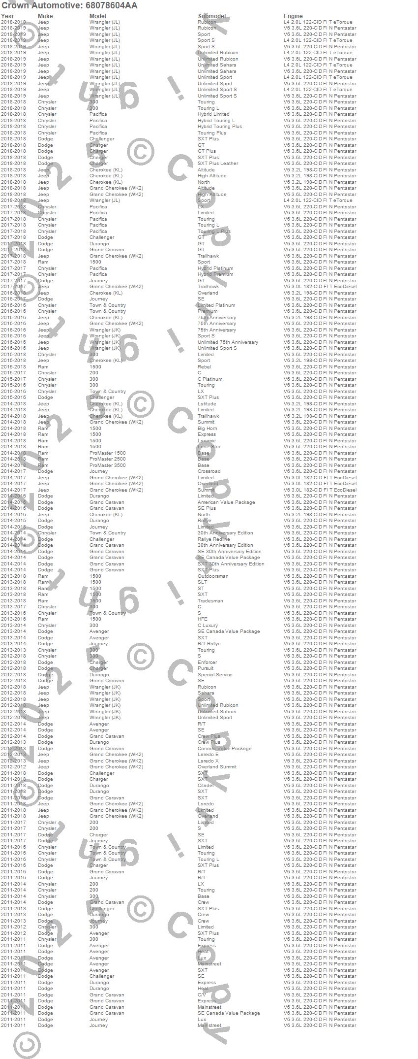 1500, 200, 300, Avenger, Challenger, Charger, Cherokee (KL), Durango, Grand Caravan, Grand Cherokee (WK2), Journey, ProMaster 1500, ProMaster 2500, ProMaster 3500, Town & Country, Wrangler (JK), Chrysler, Dodge, Jeep, Ram more…