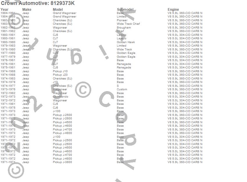 Cherokee (SJ), CJ5, CJ6, CJ7, Commando, DJ5, DJ5C, Grand Wagoneer, J-100, J-2500, J-2600, J-3800, J-4500, J-4600, J-4700, J-4800, J10, J20, Jeepster, Wagoneer more…