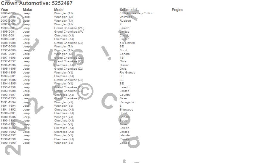 Crown Automotive is the premier manufacturer and distributor of quality replacement parts for Jeep® CJ™, Wrangler™, Cherokee™, Grand Cherokee™, Liberty™, and Commander™."From humble beginnings in 1963 in a small Boston storefront, Crown Automotive has consistently maintained its commitment to offering only quality parts and exceptional service. Today, with warehouses in Massachusetts, Georgia, Nevada, Spain, and the Czech Republic, totaling over 160,000 square feet, Crown Automotive continues to be the leader in quality replacement parts for Jeep® vehicles. With over 8,000 different parts in stock for Jeep® vehicles from 1942 on up, Crown has the largest stock of replacement parts for Jeep® vehicles, including factory-discontinued parts. In fact, many of the older Jeeps are still on (and off) the road thanks to Crown parts. The Crown line consists of axle, body, brake, clutch, cooling, driveline, electrical, engine, exhaust, fuel, steering, suspension, transmission and transfer case components. Crown Automotive also offers an exclusive line of component kits and accessory products. Because we know that Jeeps are driven harder than most other vehicles, we emphasize offering only quality parts. In fact, we test parts on Jeeps before distributing them to our dealers to insure that they meet our standards for quality. Crown also supports its entire line with a 12 month/12,000 mile warranty to insure our dealers and their customers of our commitment to offering quality parts. We know from experience that Jeep® owners would rather pay a little more for a good quality part that's backed by a strong guarantee. But we know that price is important as well. So, not only will you find Crown parts to be of exceptional quality, but you'll find them at a great price too.