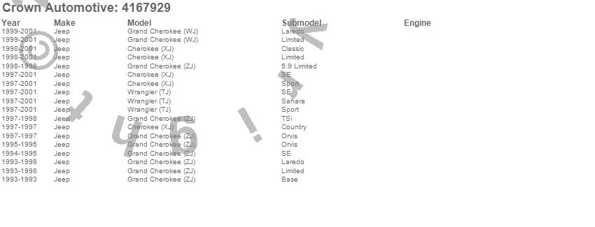 Crown Automotive is the premier manufacturer and distributor of quality replacement parts for Jeep® CJ™, Wrangler™, Cherokee™, Grand Cherokee™, Liberty™, and Commander™."From humble beginnings in 1963 in a small Boston storefront, Crown Automotive has consistently maintained its commitment to offering only quality parts and exceptional service. Today, with warehouses in Massachusetts, Georgia, Nevada, Spain, and the Czech Republic, totaling over 160,000 square feet, Crown Automotive continues to be the leader in quality replacement parts for Jeep® vehicles. With over 8,000 different parts in stock for Jeep® vehicles from 1942 on up, Crown has the largest stock of replacement parts for Jeep® vehicles, including factory-discontinued parts. In fact, many of the older Jeeps are still on (and off) the road thanks to Crown parts. The Crown line consists of axle, body, brake, clutch, cooling, driveline, electrical, engine, exhaust, fuel, steering, suspension, transmission and transfer case components. Crown Automotive also offers an exclusive line of component kits and accessory products. Because we know that Jeeps are driven harder than most other vehicles, we emphasize offering only quality parts. In fact, we test parts on Jeeps before distributing them to our dealers to insure that they meet our standards for quality. Crown also supports its entire line with a 12 month/12,000 mile warranty to insure our dealers and their customers of our commitment to offering quality parts. We know from experience that Jeep® owners would rather pay a little more for a good quality part that's backed by a strong guarantee. But we know that price is important as well. So, not only will you find Crown parts to be of exceptional quality, but you'll find them at a great price too.