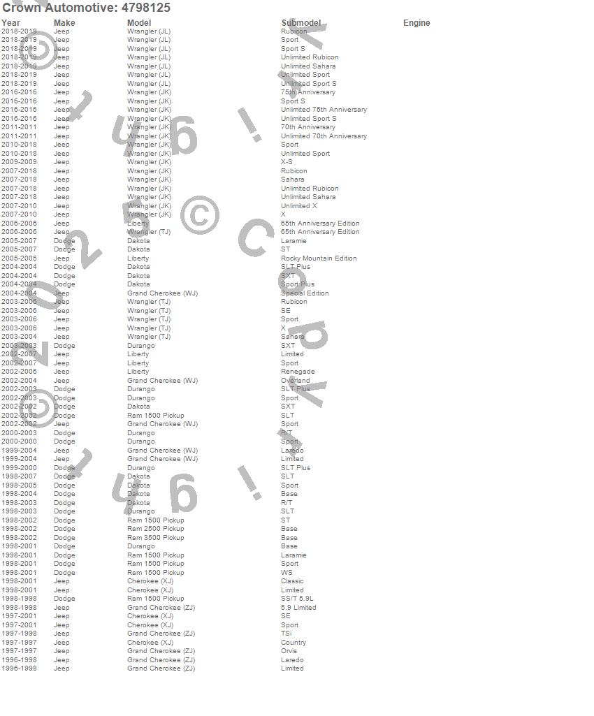 Crown Automotive is the premier manufacturer and distributor of quality replacement parts for Jeep® CJ™, Wrangler™, Cherokee™, Grand Cherokee™, Liberty™, and Commander™."From humble beginnings in 1963 in a small Boston storefront, Crown Automotive has consistently maintained its commitment to offering only quality parts and exceptional service. Today, with warehouses in Massachusetts, Georgia, Nevada, Spain, and the Czech Republic, totaling over 160,000 square feet, Crown Automotive continues to be the leader in quality replacement parts for Jeep® vehicles. With over 8,000 different parts in stock for Jeep® vehicles from 1942 on up, Crown has the largest stock of replacement parts for Jeep® vehicles, including factory-discontinued parts. In fact, many of the older Jeeps are still on (and off) the road thanks to Crown parts. The Crown line consists of axle, body, brake, clutch, cooling, driveline, electrical, engine, exhaust, fuel, steering, suspension, transmission and transfer case components. Crown Automotive also offers an exclusive line of component kits and accessory products. Because we know that Jeeps are driven harder than most other vehicles, we emphasize offering only quality parts. In fact, we test parts on Jeeps before distributing them to our dealers to insure that they meet our standards for quality. Crown also supports its entire line with a 12 month/12,000 mile warranty to insure our dealers and their customers of our commitment to offering quality parts. We know from experience that Jeep® owners would rather pay a little more for a good quality part that's backed by a strong guarantee. But we know that price is important as well. So, not only will you find Crown parts to be of exceptional quality, but you'll find them at a great price too.