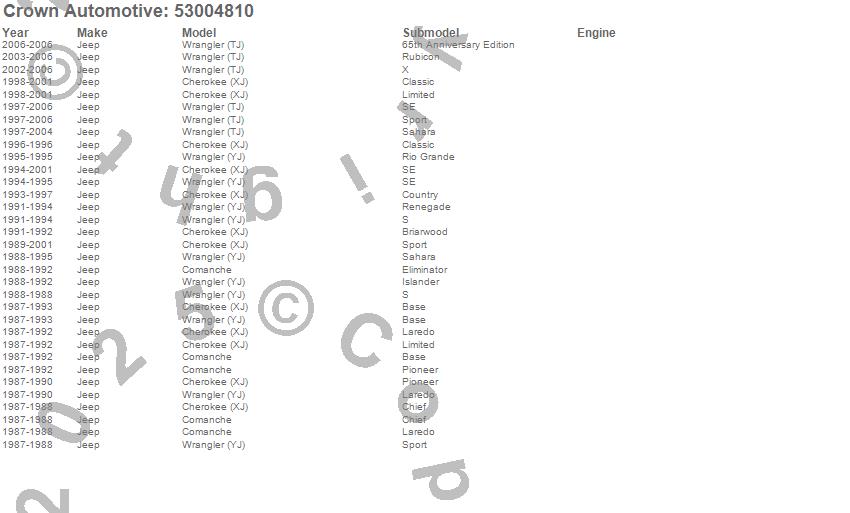 Crown Automotive is the premier manufacturer and distributor of quality replacement parts for Jeep® CJ™, Wrangler™, Cherokee™, Grand Cherokee™, Liberty™, and Commander™."From humble beginnings in 1963 in a small Boston storefront, Crown Automotive has consistently maintained its commitment to offering only quality parts and exceptional service. Today, with warehouses in Massachusetts, Georgia, Nevada, Spain, and the Czech Republic, totaling over 160,000 square feet, Crown Automotive continues to be the leader in quality replacement parts for Jeep® vehicles. With over 8,000 different parts in stock for Jeep® vehicles from 1942 on up, Crown has the largest stock of replacement parts for Jeep® vehicles, including factory-discontinued parts. In fact, many of the older Jeeps are still on (and off) the road thanks to Crown parts. The Crown line consists of axle, body, brake, clutch, cooling, driveline, electrical, engine, exhaust, fuel, steering, suspension, transmission and transfer case components. Crown Automotive also offers an exclusive line of component kits and accessory products. Because we know that Jeeps are driven harder than most other vehicles, we emphasize offering only quality parts. In fact, we test parts on Jeeps before distributing them to our dealers to insure that they meet our standards for quality. Crown also supports its entire line with a 12 month/12,000 mile warranty to insure our dealers and their customers of our commitment to offering quality parts. We know from experience that Jeep® owners would rather pay a little more for a good quality part that's backed by a strong guarantee. But we know that price is important as well. So, not only will you find Crown parts to be of exceptional quality, but you'll find them at a great price too.
