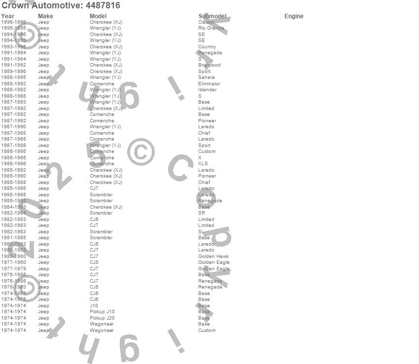 Crown Automotive is the premier manufacturer and distributor of quality replacement parts for Jeep® CJ™, Wrangler™, Cherokee™, Grand Cherokee™, Liberty™, and Commander™."From humble beginnings in 1963 in a small Boston storefront, Crown Automotive has consistently maintained its commitment to offering only quality parts and exceptional service. Today, with warehouses in Massachusetts, Georgia, Nevada, Spain, and the Czech Republic, totaling over 160,000 square feet, Crown Automotive continues to be the leader in quality replacement parts for Jeep® vehicles. With over 8,000 different parts in stock for Jeep® vehicles from 1942 on up, Crown has the largest stock of replacement parts for Jeep® vehicles, including factory-discontinued parts. In fact, many of the older Jeeps are still on (and off) the road thanks to Crown parts. The Crown line consists of axle, body, brake, clutch, cooling, driveline, electrical, engine, exhaust, fuel, steering, suspension, transmission and transfer case components. Crown Automotive also offers an exclusive line of component kits and accessory products. Because we know that Jeeps are driven harder than most other vehicles, we emphasize offering only quality parts. In fact, we test parts on Jeeps before distributing them to our dealers to insure that they meet our standards for quality. Crown also supports its entire line with a 12 month/12,000 mile warranty to insure our dealers and their customers of our commitment to offering quality parts. We know from experience that Jeep® owners would rather pay a little more for a good quality part that's backed by a strong guarantee. But we know that price is important as well. So, not only will you find Crown parts to be of exceptional quality, but you'll find them at a great price too.