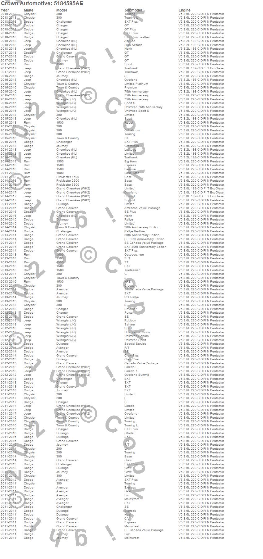 1500, 200, 300, Avenger, Challenger, Charger, Cherokee (KL), Durango, Grand Caravan, Grand Cherokee (WK2), Journey, ProMaster 1500, ProMaster 2500, ProMaster 3500, Town & Country, Wrangler (JK), Chrysler, Dodge, Jeep, Ram more…