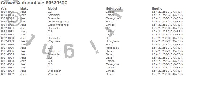 Crown Automotive is the premier manufacturer and distributor of quality replacement parts for Jeep® CJ™, Wrangler™, Cherokee™, Grand Cherokee™, Liberty™, and Commander™."From humble beginnings in 1963 in a small Boston storefront, Crown Automotive has consistently maintained its commitment to offering only quality parts and exceptional service. Today, with warehouses in Massachusetts, Georgia, Nevada, Spain, and the Czech Republic, totaling over 160,000 square feet, Crown Automotive continues to be the leader in quality replacement parts for Jeep® vehicles. With over 8,000 different parts in stock for Jeep® vehicles from 1942 on up, Crown has the largest stock of replacement parts for Jeep® vehicles, including factory-discontinued parts. In fact, many of the older Jeeps are still on (and off) the road thanks to Crown parts. The Crown line consists of axle, body, brake, clutch, cooling, driveline, electrical, engine, exhaust, fuel, steering, suspension, transmission and transfer case components. Crown Automotive also offers an exclusive line of component kits and accessory products. Because we know that Jeeps are driven harder than most other vehicles, we emphasize offering only quality parts. In fact, we test parts on Jeeps before distributing them to our dealers to insure that they meet our standards for quality. Crown also supports its entire line with a 12 month/12,000 mile warranty to insure our dealers and their customers of our commitment to offering quality parts. We know from experience that Jeep® owners would rather pay a little more for a good quality part that's backed by a strong guarantee. But we know that price is important as well. So, not only will you find Crown parts to be of exceptional quality, but you'll find them at a great price too.