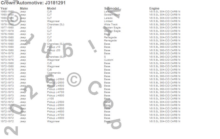 Cherokee (SJ), CJ5, CJ6, CJ7, Commando, DJ5, DJ5C, J-100, J-2500, J-2600, J-4500, J-4600, J-4700, J-4800, J10, J20, Jeepster, Wagoneer, Jeep, 1980 more…