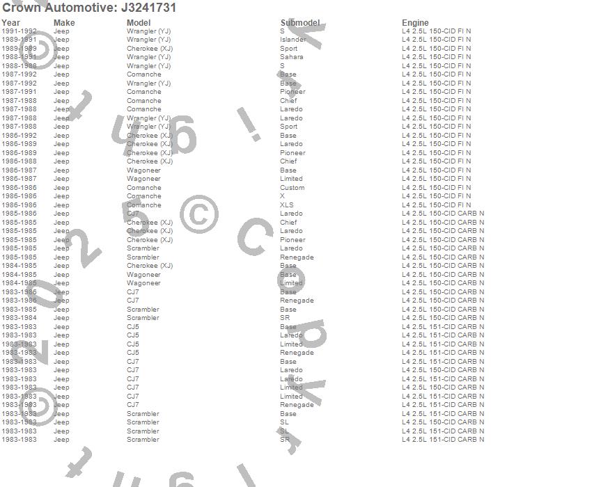 Crown Automotive is the premier manufacturer and distributor of quality replacement parts for Jeep® CJ™, Wrangler™, Cherokee™, Grand Cherokee™, Liberty™, and Commander™."From humble beginnings in 1963 in a small Boston storefront, Crown Automotive has consistently maintained its commitment to offering only quality parts and exceptional service. Today, with warehouses in Massachusetts, Georgia, Nevada, Spain, and the Czech Republic, totaling over 160,000 square feet, Crown Automotive continues to be the leader in quality replacement parts for Jeep® vehicles. With over 8,000 different parts in stock for Jeep® vehicles from 1942 on up, Crown has the largest stock of replacement parts for Jeep® vehicles, including factory-discontinued parts. In fact, many of the older Jeeps are still on (and off) the road thanks to Crown parts. The Crown line consists of axle, body, brake, clutch, cooling, driveline, electrical, engine, exhaust, fuel, steering, suspension, transmission and transfer case components. Crown Automotive also offers an exclusive line of component kits and accessory products. Because we know that Jeeps are driven harder than most other vehicles, we emphasize offering only quality parts. In fact, we test parts on Jeeps before distributing them to our dealers to insure that they meet our standards for quality. Crown also supports its entire line with a 12 month/12,000 mile warranty to insure our dealers and their customers of our commitment to offering quality parts. We know from experience that Jeep® owners would rather pay a little more for a good quality part that's backed by a strong guarantee. But we know that price is important as well. So, not only will you find Crown parts to be of exceptional quality, but you'll find them at a great price too.