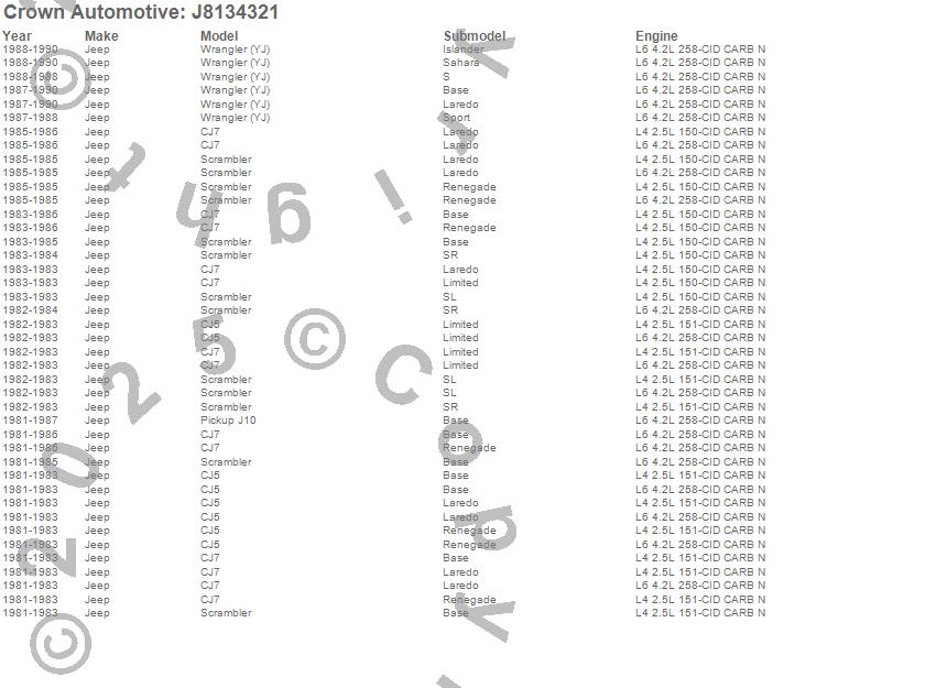 Crown Automotive is the premier manufacturer and distributor of quality replacement parts for Jeep® CJ™, Wrangler™, Cherokee™, Grand Cherokee™, Liberty™, and Commander™."From humble beginnings in 1963 in a small Boston storefront, Crown Automotive has consistently maintained its commitment to offering only quality parts and exceptional service. Today, with warehouses in Massachusetts, Georgia, Nevada, Spain, and the Czech Republic, totaling over 160,000 square feet, Crown Automotive continues to be the leader in quality replacement parts for Jeep® vehicles. With over 8,000 different parts in stock for Jeep® vehicles from 1942 on up, Crown has the largest stock of replacement parts for Jeep® vehicles, including factory-discontinued parts. In fact, many of the older Jeeps are still on (and off) the road thanks to Crown parts. The Crown line consists of axle, body, brake, clutch, cooling, driveline, electrical, engine, exhaust, fuel, steering, suspension, transmission and transfer case components. Crown Automotive also offers an exclusive line of component kits and accessory products. Because we know that Jeeps are driven harder than most other vehicles, we emphasize offering only quality parts. In fact, we test parts on Jeeps before distributing them to our dealers to insure that they meet our standards for quality. Crown also supports its entire line with a 12 month/12,000 mile warranty to insure our dealers and their customers of our commitment to offering quality parts. We know from experience that Jeep® owners would rather pay a little more for a good quality part that's backed by a strong guarantee. But we know that price is important as well. So, not only will you find Crown parts to be of exceptional quality, but you'll find them at a great price too.
