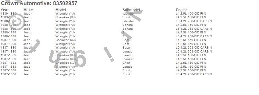 Crown Automotive is the premier manufacturer and distributor of quality replacement parts for Jeep® CJ™, Wrangler™, Cherokee™, Grand Cherokee™, Liberty™, and Commander™."From humble beginnings in 1963 in a small Boston storefront, Crown Automotive has consistently maintained its commitment to offering only quality parts and exceptional service. Today, with warehouses in Massachusetts, Georgia, Nevada, Spain, and the Czech Republic, totaling over 160,000 square feet, Crown Automotive continues to be the leader in quality replacement parts for Jeep® vehicles. With over 8,000 different parts in stock for Jeep® vehicles from 1942 on up, Crown has the largest stock of replacement parts for Jeep® vehicles, including factory-discontinued parts. In fact, many of the older Jeeps are still on (and off) the road thanks to Crown parts. The Crown line consists of axle, body, brake, clutch, cooling, driveline, electrical, engine, exhaust, fuel, steering, suspension, transmission and transfer case components. Crown Automotive also offers an exclusive line of component kits and accessory products. Because we know that Jeeps are driven harder than most other vehicles, we emphasize offering only quality parts. In fact, we test parts on Jeeps before distributing them to our dealers to insure that they meet our standards for quality. Crown also supports its entire line with a 12 month/12,000 mile warranty to insure our dealers and their customers of our commitment to offering quality parts. We know from experience that Jeep® owners would rather pay a little more for a good quality part that's backed by a strong guarantee. But we know that price is important as well. So, not only will you find Crown parts to be of exceptional quality, but you'll find them at a great price too.