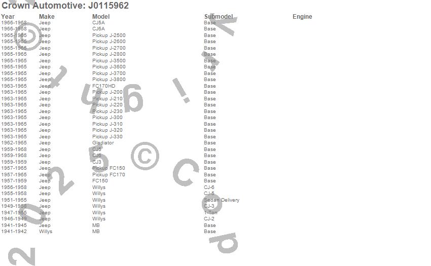 1-Ton Pickup, CJ-2A, CJ-3A, CJ-3B, CJ5, CJ5A, CJ6, CJ6A, FC150, FC170, FC170HD, Gladiator, J-200, J-210, J-220, J-230, J-2500, J-2600, J-2700, J-2800 more…