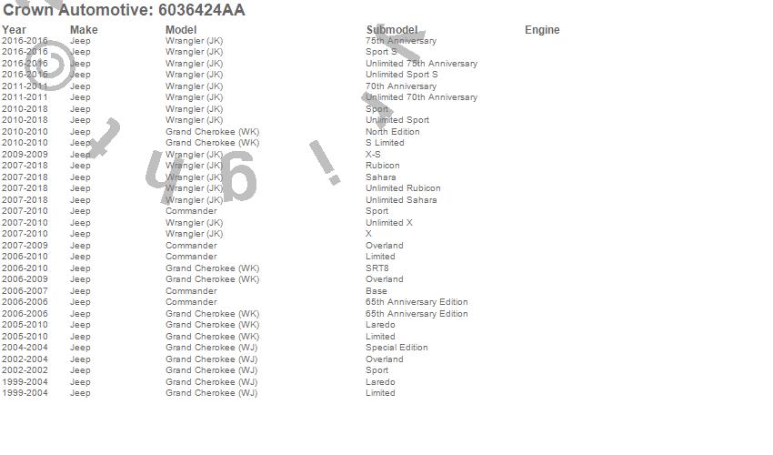 Crown Automotive is the premier manufacturer and distributor of quality replacement parts for Jeep® CJ™, Wrangler™, Cherokee™, Grand Cherokee™, Liberty™, and Commander™."From humble beginnings in 1963 in a small Boston storefront, Crown Automotive has consistently maintained its commitment to offering only quality parts and exceptional service. Today, with warehouses in Massachusetts, Georgia, Nevada, Spain, and the Czech Republic, totaling over 160,000 square feet, Crown Automotive continues to be the leader in quality replacement parts for Jeep® vehicles. With over 8,000 different parts in stock for Jeep® vehicles from 1942 on up, Crown has the largest stock of replacement parts for Jeep® vehicles, including factory-discontinued parts. In fact, many of the older Jeeps are still on (and off) the road thanks to Crown parts. The Crown line consists of axle, body, brake, clutch, cooling, driveline, electrical, engine, exhaust, fuel, steering, suspension, transmission and transfer case components. Crown Automotive also offers an exclusive line of component kits and accessory products. Because we know that Jeeps are driven harder than most other vehicles, we emphasize offering only quality parts. In fact, we test parts on Jeeps before distributing them to our dealers to insure that they meet our standards for quality. Crown also supports its entire line with a 12 month/12,000 mile warranty to insure our dealers and their customers of our commitment to offering quality parts. We know from experience that Jeep® owners would rather pay a little more for a good quality part that's backed by a strong guarantee. But we know that price is important as well. So, not only will you find Crown parts to be of exceptional quality, but you'll find them at a great price too.