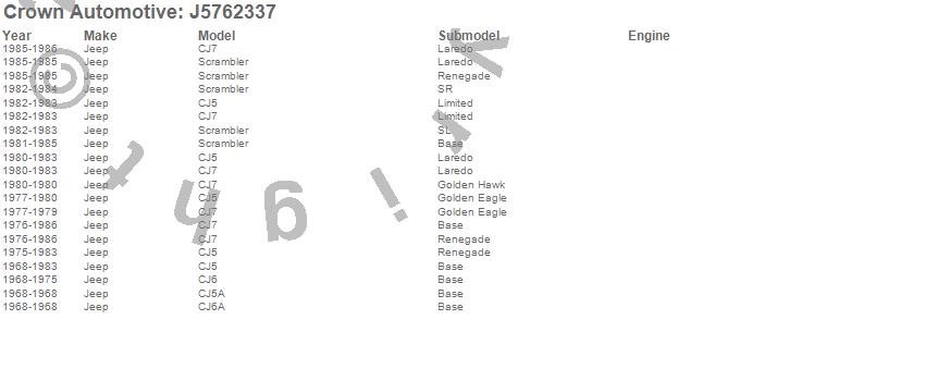 Crown Automotive is the premier manufacturer and distributor of quality replacement parts for Jeep® CJ™, Wrangler™, Cherokee™, Grand Cherokee™, Liberty™, and Commander™."From humble beginnings in 1963 in a small Boston storefront, Crown Automotive has consistently maintained its commitment to offering only quality parts and exceptional service. Today, with warehouses in Massachusetts, Georgia, Nevada, Spain, and the Czech Republic, totaling over 160,000 square feet, Crown Automotive continues to be the leader in quality replacement parts for Jeep® vehicles. With over 8,000 different parts in stock for Jeep® vehicles from 1942 on up, Crown has the largest stock of replacement parts for Jeep® vehicles, including factory-discontinued parts. In fact, many of the older Jeeps are still on (and off) the road thanks to Crown parts. The Crown line consists of axle, body, brake, clutch, cooling, driveline, electrical, engine, exhaust, fuel, steering, suspension, transmission and transfer case components. Crown Automotive also offers an exclusive line of component kits and accessory products. Because we know that Jeeps are driven harder than most other vehicles, we emphasize offering only quality parts. In fact, we test parts on Jeeps before distributing them to our dealers to insure that they meet our standards for quality. Crown also supports its entire line with a 12 month/12,000 mile warranty to insure our dealers and their customers of our commitment to offering quality parts. We know from experience that Jeep® owners would rather pay a little more for a good quality part that's backed by a strong guarantee. But we know that price is important as well. So, not only will you find Crown parts to be of exceptional quality, but you'll find them at a great price too.