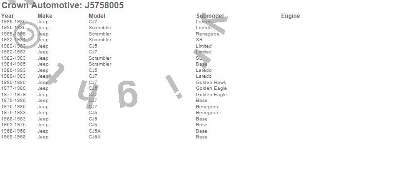 Crown Automotive is the premier manufacturer and distributor of quality replacement parts for Jeep® CJ™, Wrangler™, Cherokee™, Grand Cherokee™, Liberty™, and Commander™."From humble beginnings in 1963 in a small Boston storefront, Crown Automotive has consistently maintained its commitment to offering only quality parts and exceptional service. Today, with warehouses in Massachusetts, Georgia, Nevada, Spain, and the Czech Republic, totaling over 160,000 square feet, Crown Automotive continues to be the leader in quality replacement parts for Jeep® vehicles. With over 8,000 different parts in stock for Jeep® vehicles from 1942 on up, Crown has the largest stock of replacement parts for Jeep® vehicles, including factory-discontinued parts. In fact, many of the older Jeeps are still on (and off) the road thanks to Crown parts. The Crown line consists of axle, body, brake, clutch, cooling, driveline, electrical, engine, exhaust, fuel, steering, suspension, transmission and transfer case components. Crown Automotive also offers an exclusive line of component kits and accessory products. Because we know that Jeeps are driven harder than most other vehicles, we emphasize offering only quality parts. In fact, we test parts on Jeeps before distributing them to our dealers to insure that they meet our standards for quality. Crown also supports its entire line with a 12 month/12,000 mile warranty to insure our dealers and their customers of our commitment to offering quality parts. We know from experience that Jeep® owners would rather pay a little more for a good quality part that's backed by a strong guarantee. But we know that price is important as well. So, not only will you find Crown parts to be of exceptional quality, but you'll find them at a great price too.