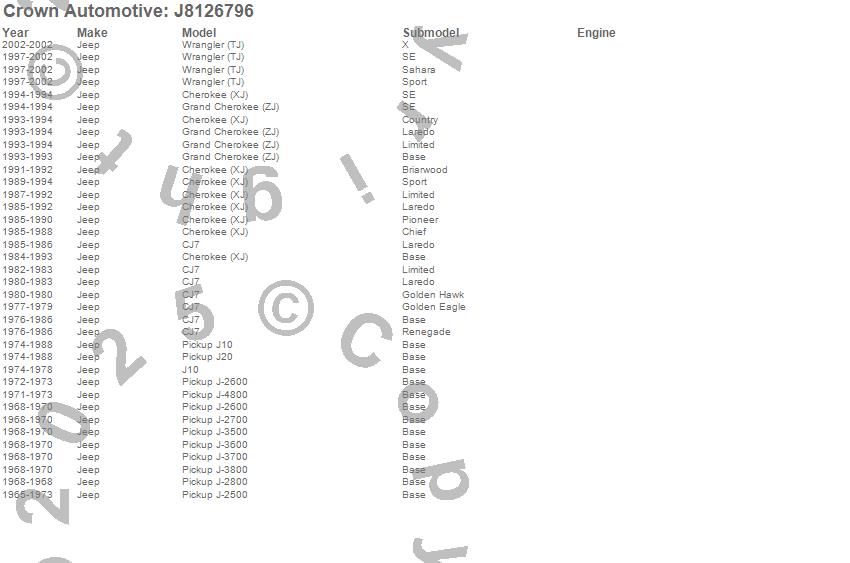 Cherokee (XJ), CJ7, Grand Cherokee (ZJ), J-2500, J-2600, J-2700, J-2800, J-3500, J-3600, J-3700, J-3800, J-4800, J10, J20, Wrangler (TJ), Jeep, 2002, 2001, 2000, 1999 more…