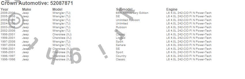 Crown Automotive is the premier manufacturer and distributor of quality replacement parts for Jeep® CJ™, Wrangler™, Cherokee™, Grand Cherokee™, Liberty™, and Commander™."From humble beginnings in 1963 in a small Boston storefront, Crown Automotive has consistently maintained its commitment to offering only quality parts and exceptional service. Today, with warehouses in Massachusetts, Georgia, Nevada, Spain, and the Czech Republic, totaling over 160,000 square feet, Crown Automotive continues to be the leader in quality replacement parts for Jeep® vehicles. With over 8,000 different parts in stock for Jeep® vehicles from 1942 on up, Crown has the largest stock of replacement parts for Jeep® vehicles, including factory-discontinued parts. In fact, many of the older Jeeps are still on (and off) the road thanks to Crown parts. The Crown line consists of axle, body, brake, clutch, cooling, driveline, electrical, engine, exhaust, fuel, steering, suspension, transmission and transfer case components. Crown Automotive also offers an exclusive line of component kits and accessory products. Because we know that Jeeps are driven harder than most other vehicles, we emphasize offering only quality parts. In fact, we test parts on Jeeps before distributing them to our dealers to insure that they meet our standards for quality. Crown also supports its entire line with a 12 month/12,000 mile warranty to insure our dealers and their customers of our commitment to offering quality parts. We know from experience that Jeep® owners would rather pay a little more for a good quality part that's backed by a strong guarantee. But we know that price is important as well. So, not only will you find Crown parts to be of exceptional quality, but you'll find them at a great price too.