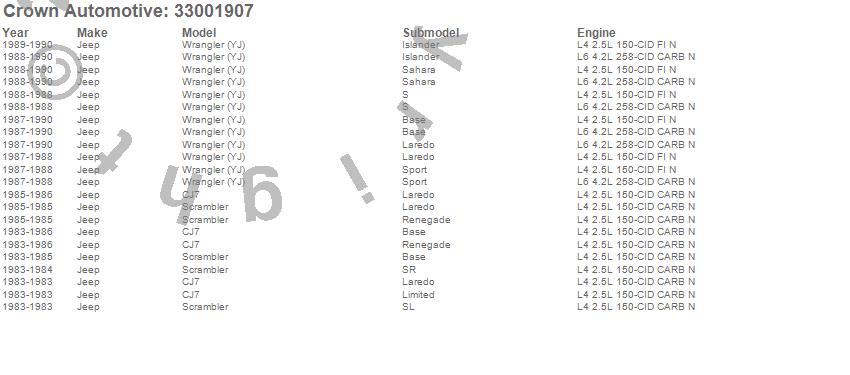 Crown Automotive is the premier manufacturer and distributor of quality replacement parts for Jeep® CJ™, Wrangler™, Cherokee™, Grand Cherokee™, Liberty™, and Commander™."From humble beginnings in 1963 in a small Boston storefront, Crown Automotive has consistently maintained its commitment to offering only quality parts and exceptional service. Today, with warehouses in Massachusetts, Georgia, Nevada, Spain, and the Czech Republic, totaling over 160,000 square feet, Crown Automotive continues to be the leader in quality replacement parts for Jeep® vehicles. With over 8,000 different parts in stock for Jeep® vehicles from 1942 on up, Crown has the largest stock of replacement parts for Jeep® vehicles, including factory-discontinued parts. In fact, many of the older Jeeps are still on (and off) the road thanks to Crown parts. The Crown line consists of axle, body, brake, clutch, cooling, driveline, electrical, engine, exhaust, fuel, steering, suspension, transmission and transfer case components. Crown Automotive also offers an exclusive line of component kits and accessory products. Because we know that Jeeps are driven harder than most other vehicles, we emphasize offering only quality parts. In fact, we test parts on Jeeps before distributing them to our dealers to insure that they meet our standards for quality. Crown also supports its entire line with a 12 month/12,000 mile warranty to insure our dealers and their customers of our commitment to offering quality parts. We know from experience that Jeep® owners would rather pay a little more for a good quality part that's backed by a strong guarantee. But we know that price is important as well. So, not only will you find Crown parts to be of exceptional quality, but you'll find them at a great price too.