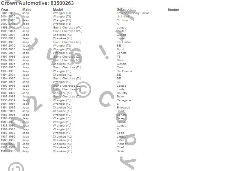 Cherokee (XJ), Grand Cherokee (WJ), Grand Cherokee (ZJ), Wrangler (LJ), Wrangler (TJ), Wrangler (YJ), Jeep, 2006, 2005, 2004, 2003, 2002, 2001, 2000, 1999, 1998, 1997, 1996, 1995, 1994 more…