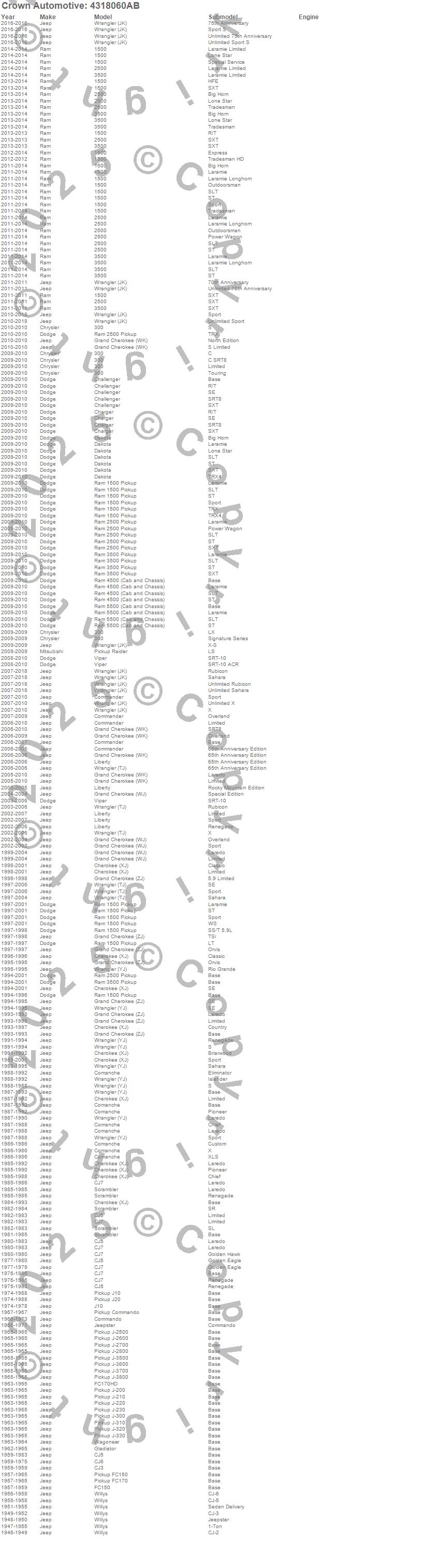 1-Ton Pickup, 1500, 2500, 300, 3500, Challenger, Charger, Cherokee (XJ), CJ-2A, CJ-3A, CJ-3B, CJ5, CJ6, CJ7, Comanche, Commander, Commando, Dakota, FC150, FC170 more…