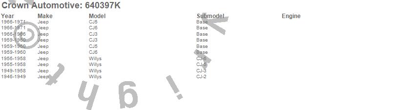 Crown Automotive is the premier manufacturer and distributor of quality replacement parts for Jeep® CJ™, Wrangler™, Cherokee™, Grand Cherokee™, Liberty™, and Commander™."From humble beginnings in 1963 in a small Boston storefront, Crown Automotive has consistently maintained its commitment to offering only quality parts and exceptional service. Today, with warehouses in Massachusetts, Georgia, Nevada, Spain, and the Czech Republic, totaling over 160,000 square feet, Crown Automotive continues to be the leader in quality replacement parts for Jeep® vehicles. With over 8,000 different parts in stock for Jeep® vehicles from 1942 on up, Crown has the largest stock of replacement parts for Jeep® vehicles, including factory-discontinued parts. In fact, many of the older Jeeps are still on (and off) the road thanks to Crown parts. The Crown line consists of axle, body, brake, clutch, cooling, driveline, electrical, engine, exhaust, fuel, steering, suspension, transmission and transfer case components. Crown Automotive also offers an exclusive line of component kits and accessory products. Because we know that Jeeps are driven harder than most other vehicles, we emphasize offering only quality parts. In fact, we test parts on Jeeps before distributing them to our dealers to insure that they meet our standards for quality. Crown also supports its entire line with a 12 month/12,000 mile warranty to insure our dealers and their customers of our commitment to offering quality parts. We know from experience that Jeep® owners would rather pay a little more for a good quality part that's backed by a strong guarantee. But we know that price is important as well. So, not only will you find Crown parts to be of exceptional quality, but you'll find them at a great price too.