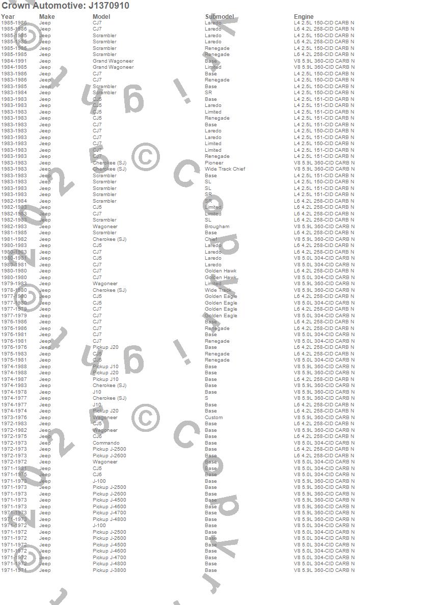 Cherokee (SJ), CJ5, CJ6, CJ7, Commando, DJ5, DJ5C, Grand Wagoneer, J-100, J-2500, J-2600, J-3800, J-4500, J-4600, J-4700, J-4800, J10, J20, Jeepster, Scrambler more…