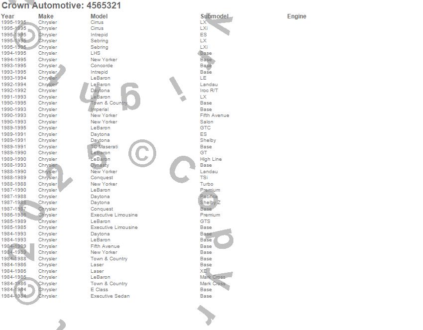 Cirrus, Concorde, Conquest, Daytona, Dynasty, E Class, Executive Limousine, Executive Sedan, Fifth Avenue, Imperial, Intrepid, Laser, LeBaron, LHS, New Yorker, Sebring, TC Maserati, Town & Country, Chrysler, 1995 more…