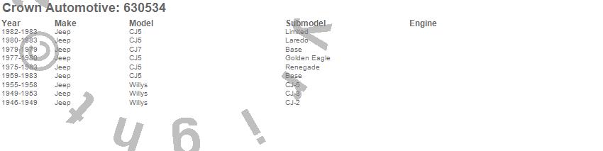 Crown Automotive is the premier manufacturer and distributor of quality replacement parts for Jeep® CJ™, Wrangler™, Cherokee™, Grand Cherokee™, Liberty™, and Commander™."From humble beginnings in 1963 in a small Boston storefront, Crown Automotive has consistently maintained its commitment to offering only quality parts and exceptional service. Today, with warehouses in Massachusetts, Georgia, Nevada, Spain, and the Czech Republic, totaling over 160,000 square feet, Crown Automotive continues to be the leader in quality replacement parts for Jeep® vehicles. With over 8,000 different parts in stock for Jeep® vehicles from 1942 on up, Crown has the largest stock of replacement parts for Jeep® vehicles, including factory-discontinued parts. In fact, many of the older Jeeps are still on (and off) the road thanks to Crown parts. The Crown line consists of axle, body, brake, clutch, cooling, driveline, electrical, engine, exhaust, fuel, steering, suspension, transmission and transfer case components. Crown Automotive also offers an exclusive line of component kits and accessory products. Because we know that Jeeps are driven harder than most other vehicles, we emphasize offering only quality parts. In fact, we test parts on Jeeps before distributing them to our dealers to insure that they meet our standards for quality. Crown also supports its entire line with a 12 month/12,000 mile warranty to insure our dealers and their customers of our commitment to offering quality parts. We know from experience that Jeep® owners would rather pay a little more for a good quality part that's backed by a strong guarantee. But we know that price is important as well. So, not only will you find Crown parts to be of exceptional quality, but you'll find them at a great price too.