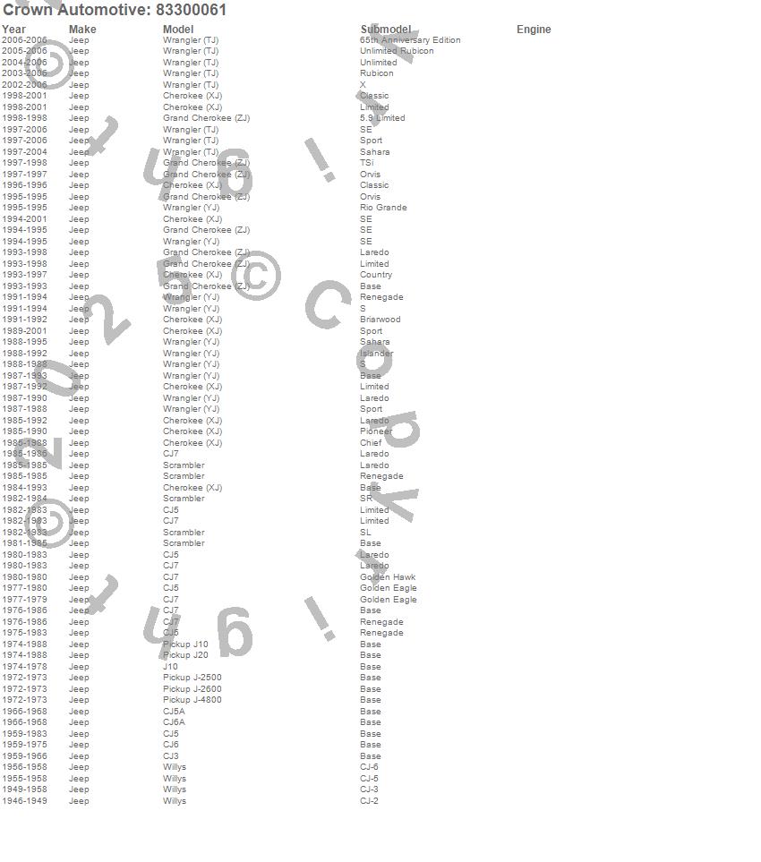 Crown Automotive is the premier manufacturer and distributor of quality replacement parts for Jeep® CJ™, Wrangler™, Cherokee™, Grand Cherokee™, Liberty™, and Commander™."From humble beginnings in 1963 in a small Boston storefront, Crown Automotive has consistently maintained its commitment to offering only quality parts and exceptional service. Today, with warehouses in Massachusetts, Georgia, Nevada, Spain, and the Czech Republic, totaling over 160,000 square feet, Crown Automotive continues to be the leader in quality replacement parts for Jeep® vehicles. With over 8,000 different parts in stock for Jeep® vehicles from 1942 on up, Crown has the largest stock of replacement parts for Jeep® vehicles, including factory-discontinued parts. In fact, many of the older Jeeps are still on (and off) the road thanks to Crown parts. The Crown line consists of axle, body, brake, clutch, cooling, driveline, electrical, engine, exhaust, fuel, steering, suspension, transmission and transfer case components. Crown Automotive also offers an exclusive line of component kits and accessory products. Because we know that Jeeps are driven harder than most other vehicles, we emphasize offering only quality parts. In fact, we test parts on Jeeps before distributing them to our dealers to insure that they meet our standards for quality. Crown also supports its entire line with a 12 month/12,000 mile warranty to insure our dealers and their customers of our commitment to offering quality parts. We know from experience that Jeep® owners would rather pay a little more for a good quality part that's backed by a strong guarantee. But we know that price is important as well. So, not only will you find Crown parts to be of exceptional quality, but you'll find them at a great price too.