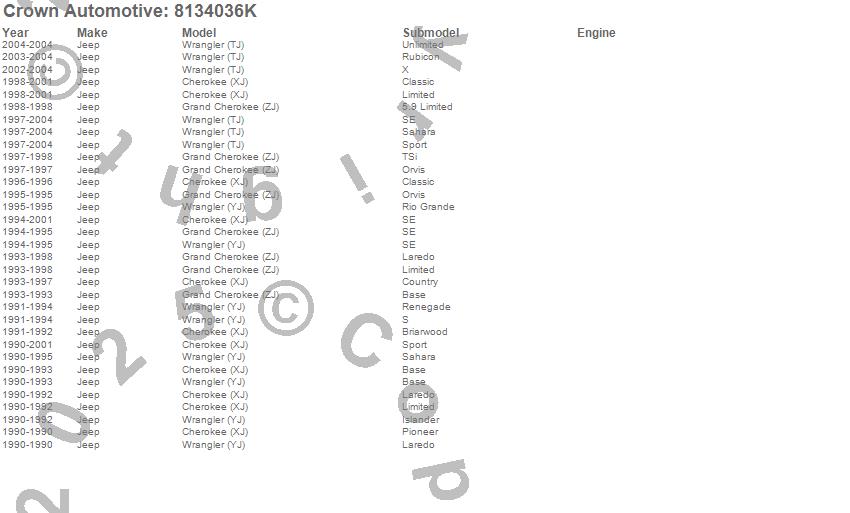 Crown Automotive is the premier manufacturer and distributor of quality replacement parts for Jeep® CJ™, Wrangler™, Cherokee™, Grand Cherokee™, Liberty™, and Commander™."From humble beginnings in 1963 in a small Boston storefront, Crown Automotive has consistently maintained its commitment to offering only quality parts and exceptional service. Today, with warehouses in Massachusetts, Georgia, Nevada, Spain, and the Czech Republic, totaling over 160,000 square feet, Crown Automotive continues to be the leader in quality replacement parts for Jeep® vehicles. With over 8,000 different parts in stock for Jeep® vehicles from 1942 on up, Crown has the largest stock of replacement parts for Jeep® vehicles, including factory-discontinued parts. In fact, many of the older Jeeps are still on (and off) the road thanks to Crown parts. The Crown line consists of axle, body, brake, clutch, cooling, driveline, electrical, engine, exhaust, fuel, steering, suspension, transmission and transfer case components. Crown Automotive also offers an exclusive line of component kits and accessory products. Because we know that Jeeps are driven harder than most other vehicles, we emphasize offering only quality parts. In fact, we test parts on Jeeps before distributing them to our dealers to insure that they meet our standards for quality. Crown also supports its entire line with a 12 month/12,000 mile warranty to insure our dealers and their customers of our commitment to offering quality parts. We know from experience that Jeep® owners would rather pay a little more for a good quality part that's backed by a strong guarantee. But we know that price is important as well. So, not only will you find Crown parts to be of exceptional quality, but you'll find them at a great price too.