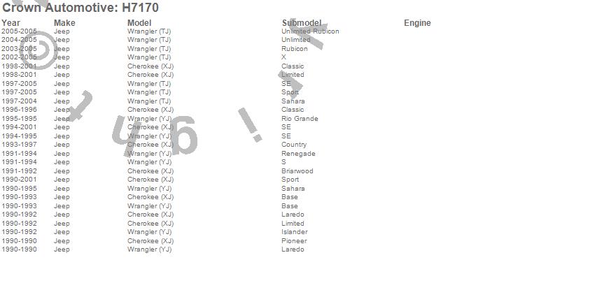 Crown Automotive is the premier manufacturer and distributor of quality replacement parts for Jeep® CJ™, Wrangler™, Cherokee™, Grand Cherokee™, Liberty™, and Commander™."From humble beginnings in 1963 in a small Boston storefront, Crown Automotive has consistently maintained its commitment to offering only quality parts and exceptional service. Today, with warehouses in Massachusetts, Georgia, Nevada, Spain, and the Czech Republic, totaling over 160,000 square feet, Crown Automotive continues to be the leader in quality replacement parts for Jeep® vehicles. With over 8,000 different parts in stock for Jeep® vehicles from 1942 on up, Crown has the largest stock of replacement parts for Jeep® vehicles, including factory-discontinued parts. In fact, many of the older Jeeps are still on (and off) the road thanks to Crown parts. The Crown line consists of axle, body, brake, clutch, cooling, driveline, electrical, engine, exhaust, fuel, steering, suspension, transmission and transfer case components. Crown Automotive also offers an exclusive line of component kits and accessory products. Because we know that Jeeps are driven harder than most other vehicles, we emphasize offering only quality parts. In fact, we test parts on Jeeps before distributing them to our dealers to insure that they meet our standards for quality. Crown also supports its entire line with a 12 month/12,000 mile warranty to insure our dealers and their customers of our commitment to offering quality parts. We know from experience that Jeep® owners would rather pay a little more for a good quality part that's backed by a strong guarantee. But we know that price is important as well. So, not only will you find Crown parts to be of exceptional quality, but you'll find them at a great price too.