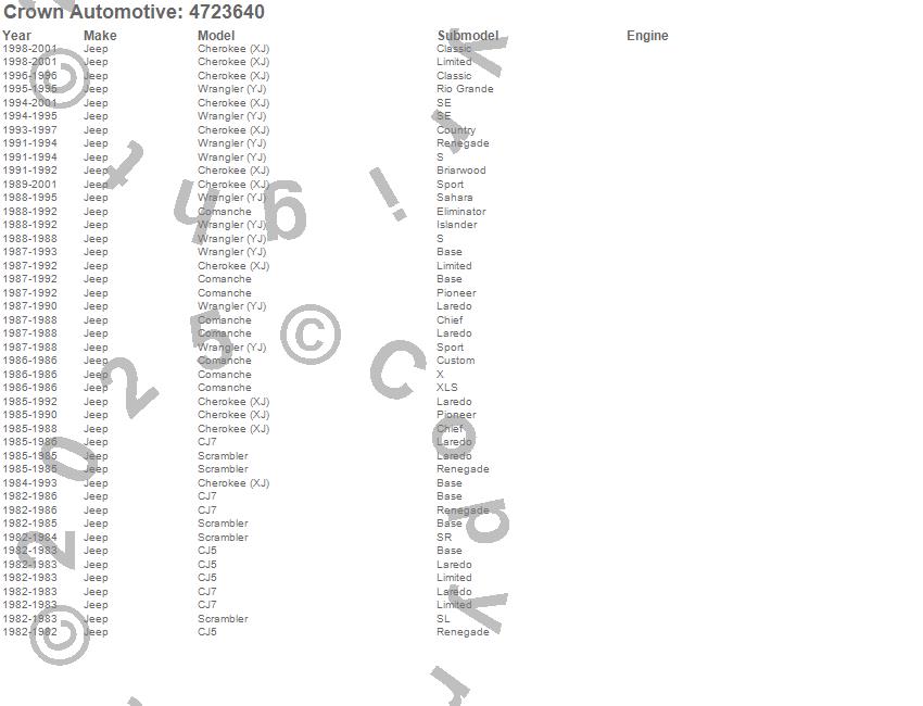 Crown Automotive is the premier manufacturer and distributor of quality replacement parts for Jeep® CJ™, Wrangler™, Cherokee™, Grand Cherokee™, Liberty™, and Commander™."From humble beginnings in 1963 in a small Boston storefront, Crown Automotive has consistently maintained its commitment to offering only quality parts and exceptional service. Today, with warehouses in Massachusetts, Georgia, Nevada, Spain, and the Czech Republic, totaling over 160,000 square feet, Crown Automotive continues to be the leader in quality replacement parts for Jeep® vehicles. With over 8,000 different parts in stock for Jeep® vehicles from 1942 on up, Crown has the largest stock of replacement parts for Jeep® vehicles, including factory-discontinued parts. In fact, many of the older Jeeps are still on (and off) the road thanks to Crown parts. The Crown line consists of axle, body, brake, clutch, cooling, driveline, electrical, engine, exhaust, fuel, steering, suspension, transmission and transfer case components. Crown Automotive also offers an exclusive line of component kits and accessory products. Because we know that Jeeps are driven harder than most other vehicles, we emphasize offering only quality parts. In fact, we test parts on Jeeps before distributing them to our dealers to insure that they meet our standards for quality. Crown also supports its entire line with a 12 month/12,000 mile warranty to insure our dealers and their customers of our commitment to offering quality parts. We know from experience that Jeep® owners would rather pay a little more for a good quality part that's backed by a strong guarantee. But we know that price is important as well. So, not only will you find Crown parts to be of exceptional quality, but you'll find them at a great price too.