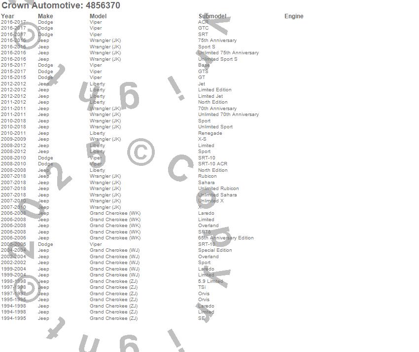Crown Automotive is the premier manufacturer and distributor of quality replacement parts for Jeep® CJ™, Wrangler™, Cherokee™, Grand Cherokee™, Liberty™, and Commander™."From humble beginnings in 1963 in a small Boston storefront, Crown Automotive has consistently maintained its commitment to offering only quality parts and exceptional service. Today, with warehouses in Massachusetts, Georgia, Nevada, Spain, and the Czech Republic, totaling over 160,000 square feet, Crown Automotive continues to be the leader in quality replacement parts for Jeep® vehicles. With over 8,000 different parts in stock for Jeep® vehicles from 1942 on up, Crown has the largest stock of replacement parts for Jeep® vehicles, including factory-discontinued parts. In fact, many of the older Jeeps are still on (and off) the road thanks to Crown parts. The Crown line consists of axle, body, brake, clutch, cooling, driveline, electrical, engine, exhaust, fuel, steering, suspension, transmission and transfer case components. Crown Automotive also offers an exclusive line of component kits and accessory products. Because we know that Jeeps are driven harder than most other vehicles, we emphasize offering only quality parts. In fact, we test parts on Jeeps before distributing them to our dealers to insure that they meet our standards for quality. Crown also supports its entire line with a 12 month/12,000 mile warranty to insure our dealers and their customers of our commitment to offering quality parts. We know from experience that Jeep® owners would rather pay a little more for a good quality part that's backed by a strong guarantee. But we know that price is important as well. So, not only will you find Crown parts to be of exceptional quality, but you'll find them at a great price too.