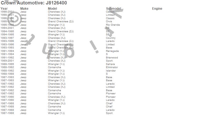 Cherokee (XJ), Comanche, Grand Cherokee (ZJ), Wrangler (YJ), Jeep, 2001, 2000, 1999, 1998, 1997, 1996, 1995, 1994, 1993, 1992, 1991, 1990, 1989, 1988, 1987 more…